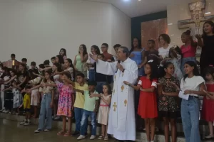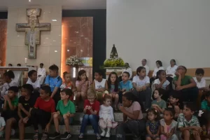 Dando continuidade a celebração eucaristica, as leituras bíblicas e o coral foi por conta das crianças. No momento da homilia, o pároco, padre Geraldo Martins convidou todas as crianças presentes para se sentarem na escada do altar para uma conversa referentes a liturgia do dia: a Solenidade de Nossa Senhora Aparecida. E como um jardim florido de diferentes flores, tivemos crianças de todas as idades.